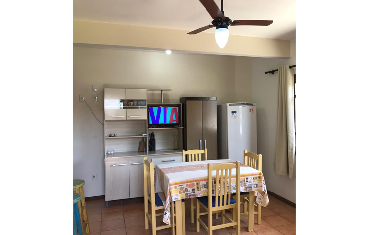 Cozinha totalmente equipada, fogão, micro-ondas , liquidificador, geladeira duplex, balcão americano ( 4 bancos ), mesa ( 4 cadeiras )