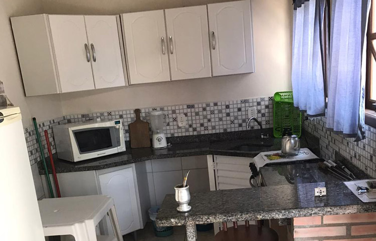 Cozinha com balcão de mármore, com mobília e louça completa, fogão, micro-ondas, liquidificador, geladeira duplex, mesa ( 4 cadeiras )